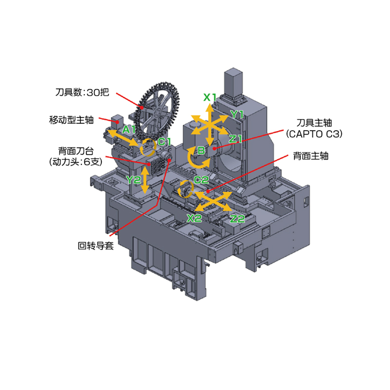 背面刃物臺最多6支動力頭,加工能力強勁;